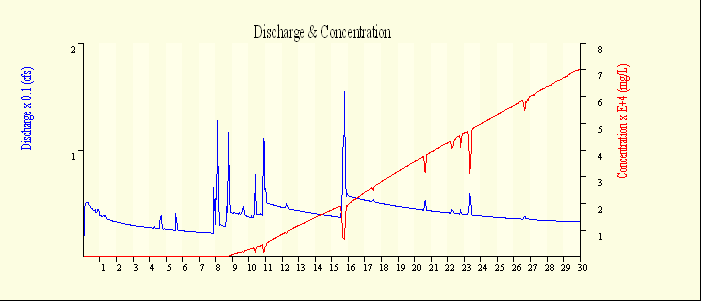 The resulting stream flow nitrogen concentration time series is shown in the figure above. Note that the initial trace of nitrogen shows up in the stream late in day 8. The maximum concentration is 0.0007 $\frac{\mbox{mg}}{\mbox{L}}$.