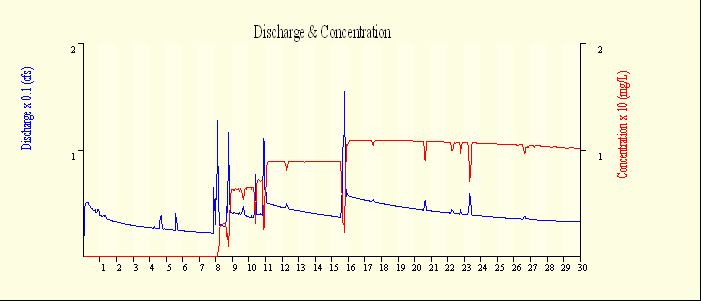 The resulting stream flow nitrogen concentration time series is shown in the figure above. Note that the initial trace of nitrogen shows up in the stream early in day 8. The maximum concentration slightly more than 0.1 $\frac{\mbox{mg}}{\mbox{L}}$.