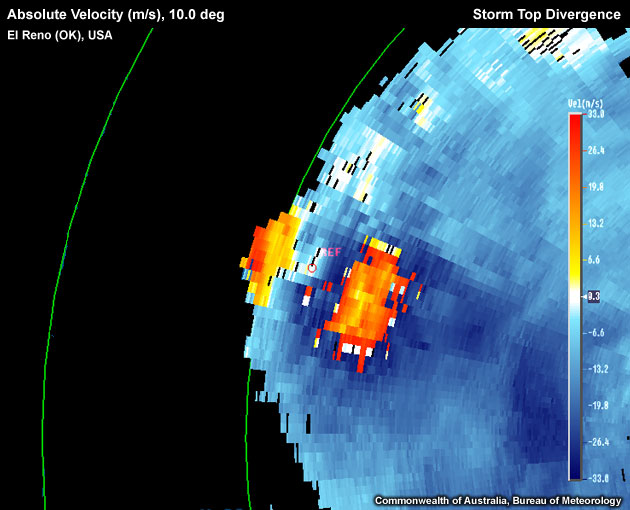 Storm Top Divergence signature located at approximately storm core top. Note the outbound branch of the divergence signature is small due to the signature only just being captured by the radar beam.