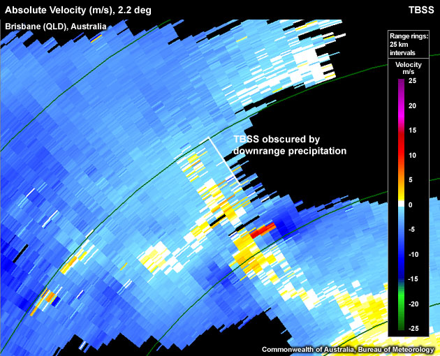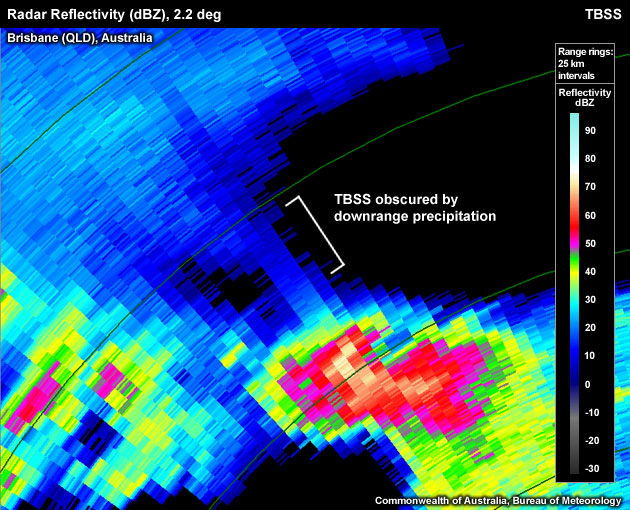 - Obscured echoes – TBSS can be obscured by either separate downrange storms or by downrange precipitation from the same storm falling from a large anvil.