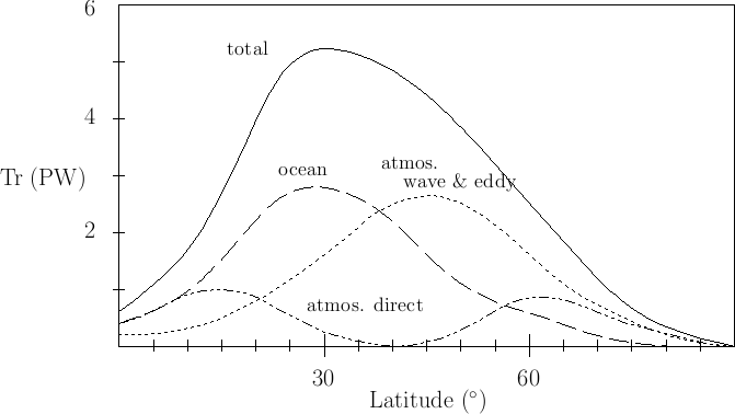 South to north energy transport in the northern hemisphere in response to the radiation energy imbalance (radiative forcing). Units of energy are petawatts ($10^{15}$ watts). The weakest component is that associated with the thermally direct Hadley and polar cells. Ocean currents and atmospheric waves and eddies have approximately equal mitigation magnitudes. Ocean currents play a larger role in the lower latitudes, while atmospheric circulations dominate in the midlatitudes.