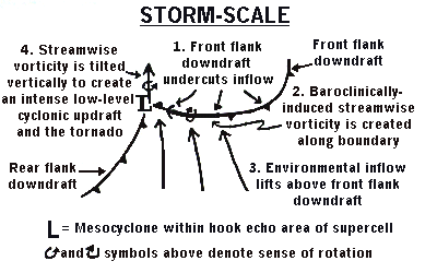 This sketch shows how the downdraft gust front, and the horizontal rotation associated with it, may interact with the updraft to initiate the circulation on a vertical axis that becomes, or enhances, the mesocyclone.