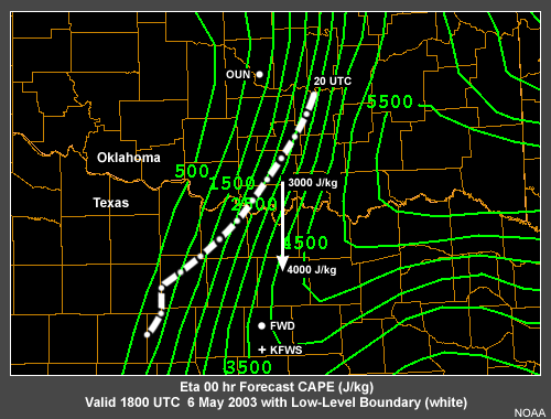 Assume it is mid-afternoon on 6 May 2003. Your job is to forecast thunderstorm development for north-central Texas during the remainder of the afternoon and early evening. At 2010 UTC low-level reflectivity data from the Fort Worth radar (KFWS) indicate a northeast to southwest boundary from central Oklahoma to the west of your area of concern.