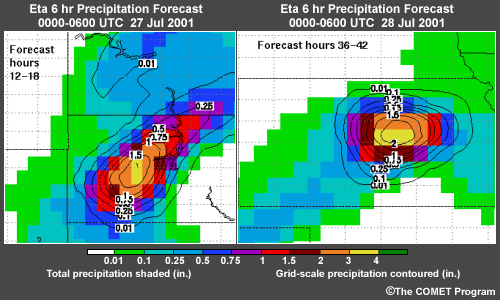 Consider these examples from the 22 kilometer operational Eta Model. It began making precipitation bull's-eyes over the plains in mid-July 2001 and continued generating such episodes even after the 24 July 2001 model upgrade. These precipitation bull's-eyes with amounts over four inches, mostly in a six-hour period, were being generated primarily by the grid-scale scheme in high-CAPE environments with strong mesoscale forcing. These forecast events were spurious and unphysical but occurred under conditions favoring strong convective systems with heavy rains. These grid-scale storms became the model's focal point for convergence, vertical motion, and instability release, causing the model to miss the forecast where the MCS actually occurred.